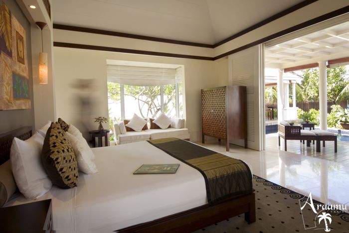 Two Bedroom Double Pool Villa (6) kb. 826 nm (kb. 88 nm lakrész): ideális családok számára, közvetlenül a parton, két hálószobával (nagyméretű franciaágy és két különálló ágy). Továbbá: 2 magánmedence, 2 lakópavilon, teljesen felszerelt konyha, napozóterasz, jakuzzi, közvetlen partkapcsolat. Minden nap reggeli és gyümölcs a villában, 1 x Intimat Moments, 1x 90 perces masszázs, üdítők, délutáni tea vagy vacsora előtti koktél és 24 órás komornyikszolgálat.